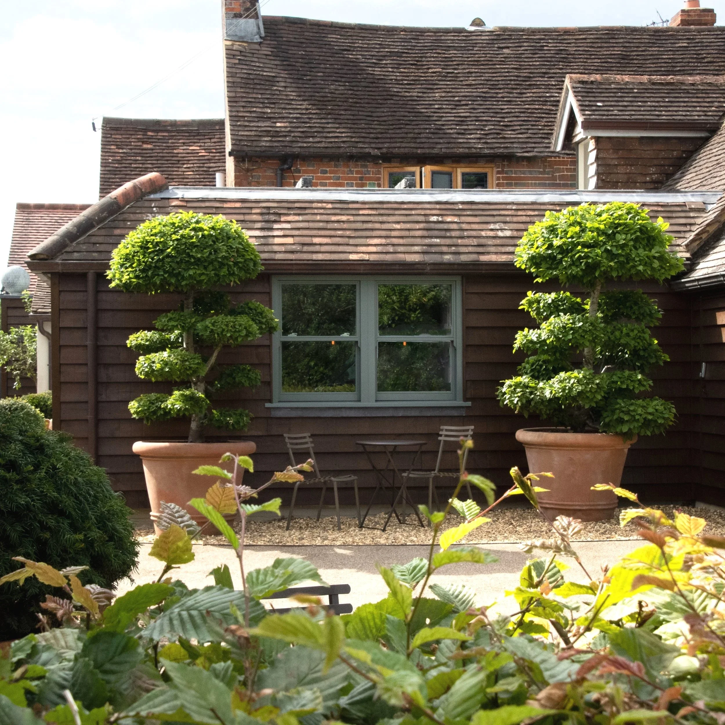 Our design purposefully worked with and enhanced what was already there: retaining original paving, integrating existing trees and hedging, repurposing materials wherever possible, as well as echoing the stunning landscape surrounding this country pub in the many changes we made. Our sustainable approach is wholly consistent with the values of Honesty Group, owner of The Crown & Garter.