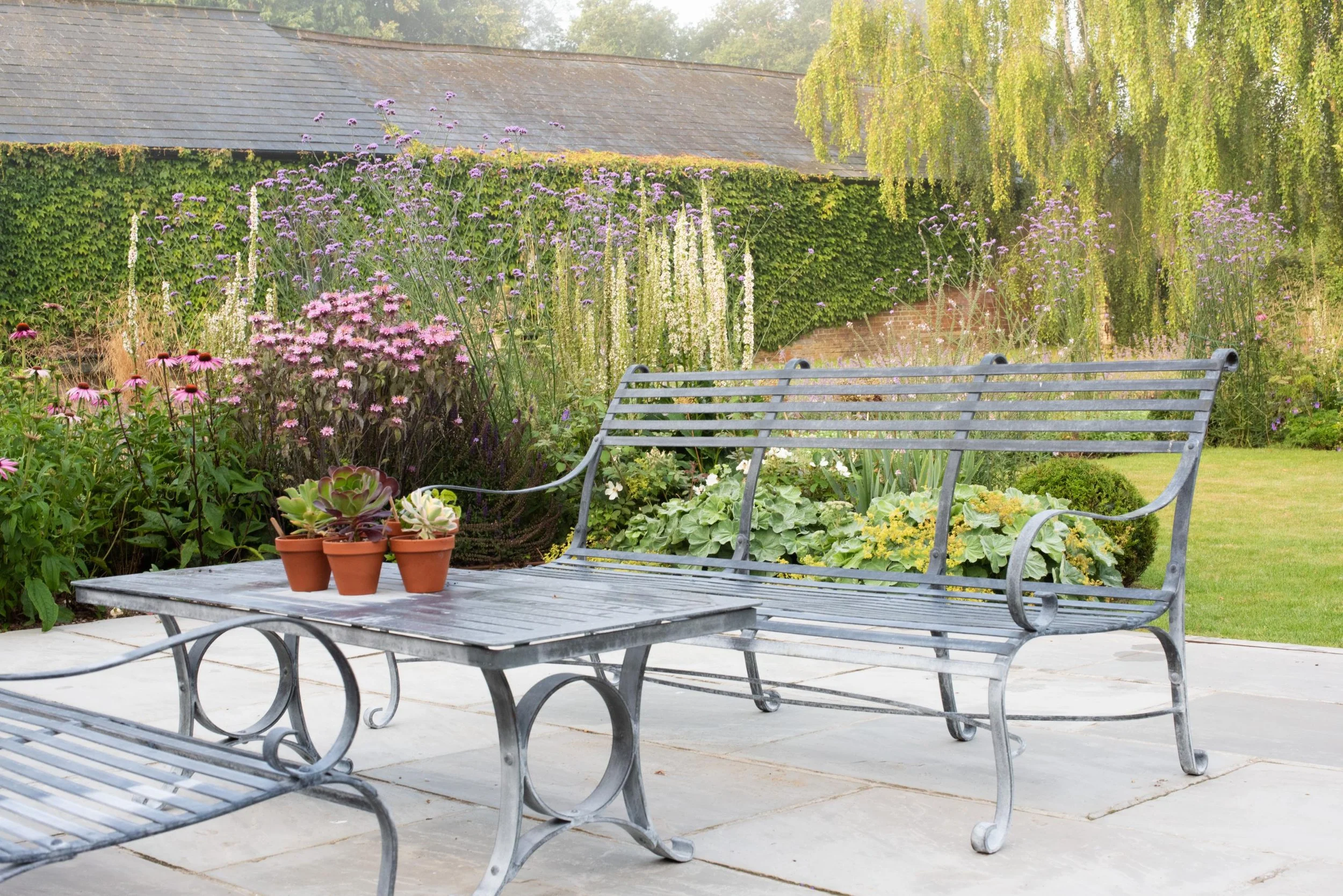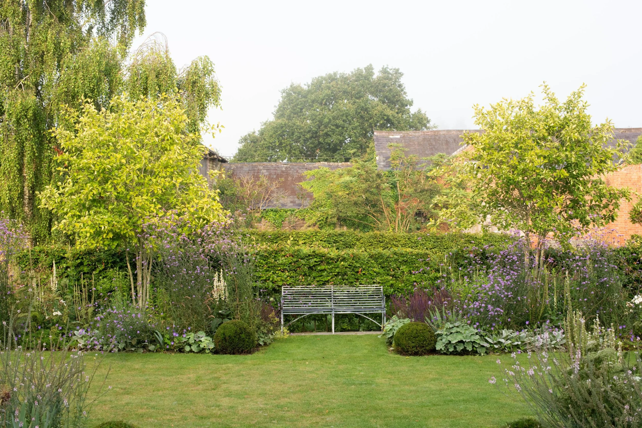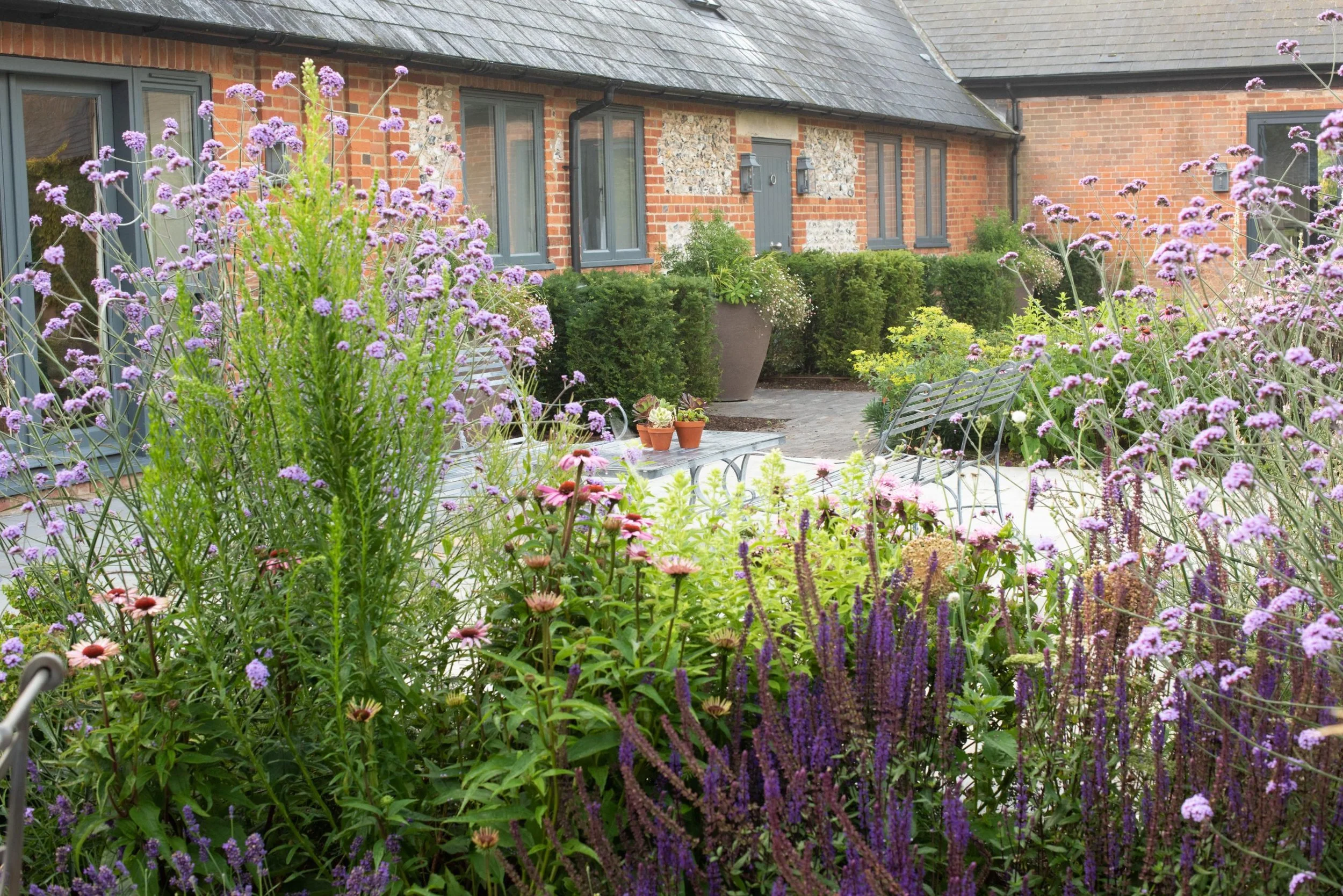 The borders are a rich blend of perennials including echinacea, monarda, astrantia and verbena, alongside glamorous ornamental grasses, surrounding a formal lawn. As a focal point, a pair of multi-stemmed hawthorn elegantly frame a charming metal bench, creating an inviting view from the main terrace. An abandoned, riveted water trough, a clue to the garden’s farmyard past, has been repurposed and planted with herbs and edibles.