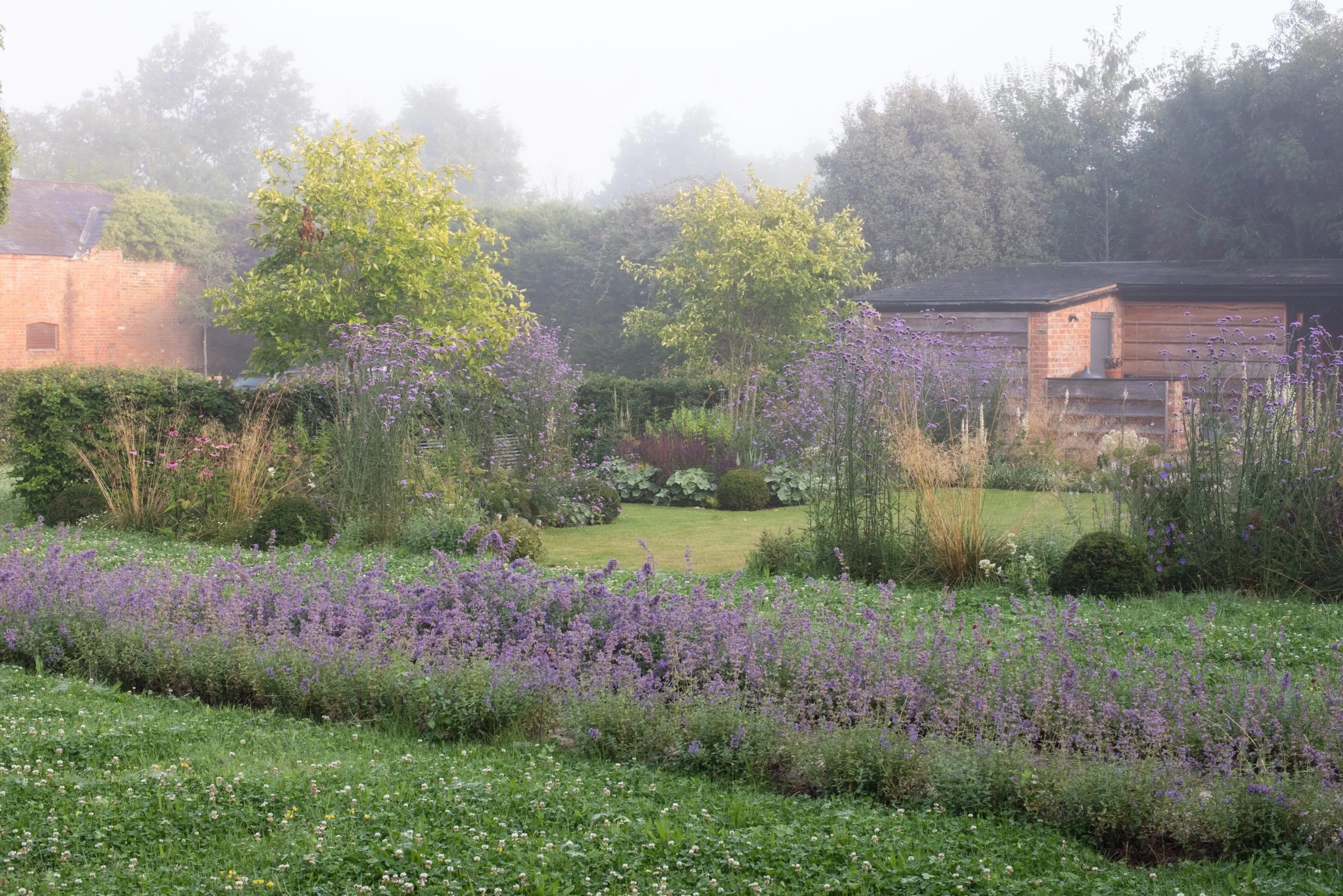 Once a farmyard, we gave this garden, in the curtilage of a listed building, a complete makeover. Our client had just a few specific requests: to create a calming, symmetrical space as an antidote to their busy life, to screen cars and incorporate a wildflower lawn.